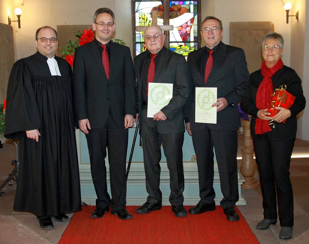 Im Auftrag und Namen des Verbandes Evangelischer Kirchenchöre in Deutschland überreichte Pfarrer Wolfgang Müller und Chorleiter Marco Friedrich eine Urkunde an Erwin Brauß (für 50 Jahre) und an Werner Kunberger (für 65 Jahre) Dienst im Kirchenchor.